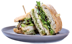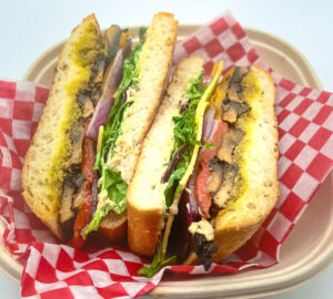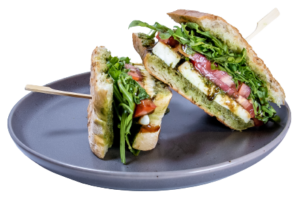 slice provolone cheese, homemade pesto, black olive tapenade & spring mix